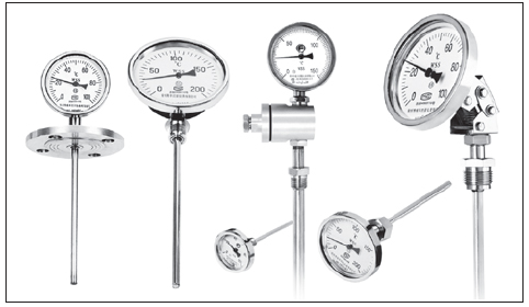 Bimetallic thermometer (hereafter referred to as simply thermometer) is a coiling thermal bimetal temperature sensor. One end is fixed inside the protective sleeve (fixed end) and another end (free end) is connected at a fine axle. The axle end is equipped with a needle. When the temperature changes, the free end of the temperature sensor rotates, hereupon, the fine axle moves the needle. The dial plate indicates the temperature change. The steering drive mechanism in the straight meter moves the needle. The meter housing is made of steel plate, cast aluminium alloy and stainless steel. For the head of the adjustable angle thermometer, by means of corrugated pipe, angle machenism and other parts, the angle can be adjusted freely from the angle type to straight type, or from the straight type to angle type. The electric contact bimetallic thermometer is added with electrical contacts, adjusting devices, outlet box etc. When the temperature fluctuates, at the moment when the needle (moving contact) and the pre-established temperature control contact (upper limit or lower limit) are connected or disconnected, the relay or the contactor in the control circuit moves, thereby, realizing automatic temperature control or producing alarm